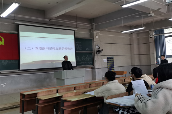 大会在庄严的国歌声中拉开序幕,张志新副书记向大会致辞。张书记介绍了学院近期组织和人事的调整;希望党员同志多关心积极向党组织靠拢的同学,多提建议,互相促进;同时,自身要发挥先锋榜样模范作用,带头承担责任,走在前列,干在实处。