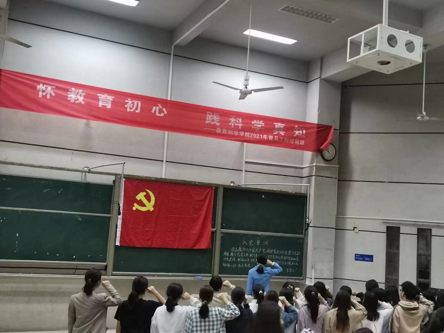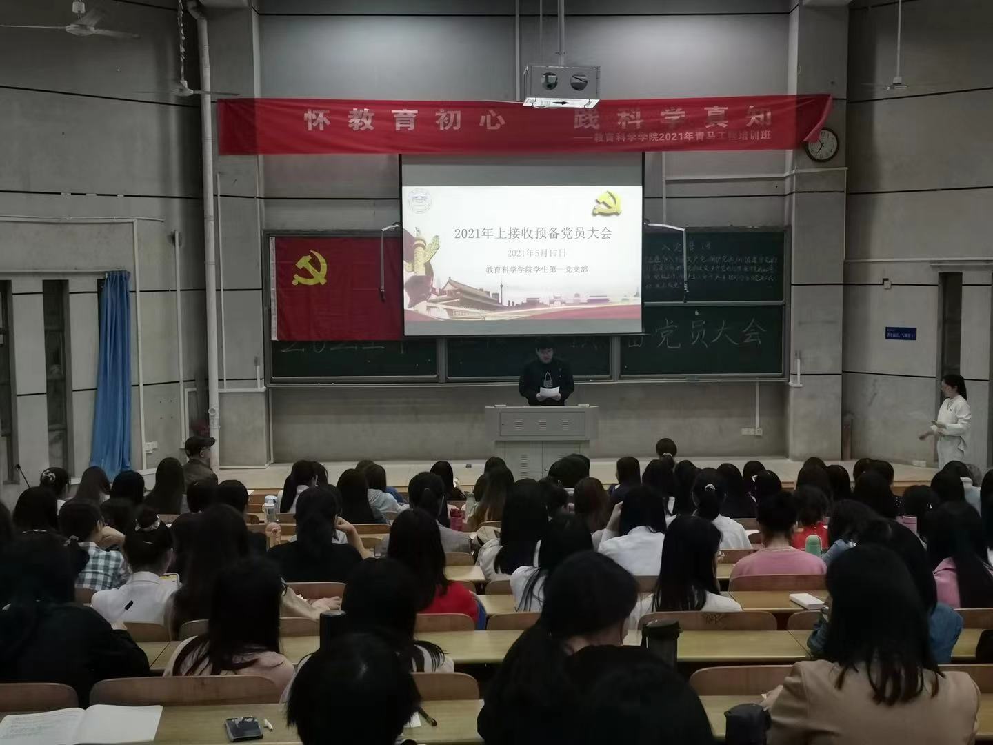 5月17日下午,教育科学学院学生第一党支部在怀中南110顺利召开预备党员接收大会,此次会议为表决邓张庆等39名发展对象转预备党员的问题。出席本次大会的老师有党总支副书记张志新同志、学工办主任刘军同志、培养人邓魁同志、孙三元同志、杨翼丞同志、学生第一党支部书记董晓娅老师以及支部的24位正式党员和79名预备党员。会议由支部组织委员郭清泉同志主持。大会开始前,刘军同志联系自身实际和切身感受发表讲话,鼓励在座同志多参加科研活动,积极与自己的入党介绍人谈话交流,不断提升自我,并对各位学生表达了真诚的祝福。