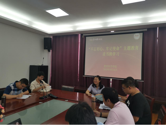 按照学院党总支关于开展主题教育的有关安排926日上午学院党总支在特立楼208会议室举办“不忘初心、牢记使命”主题教育读书班。读书班由院党总书记陈天涯同志主持,院党总支委员、班子成员、各支部委员、部分教师党员参加。