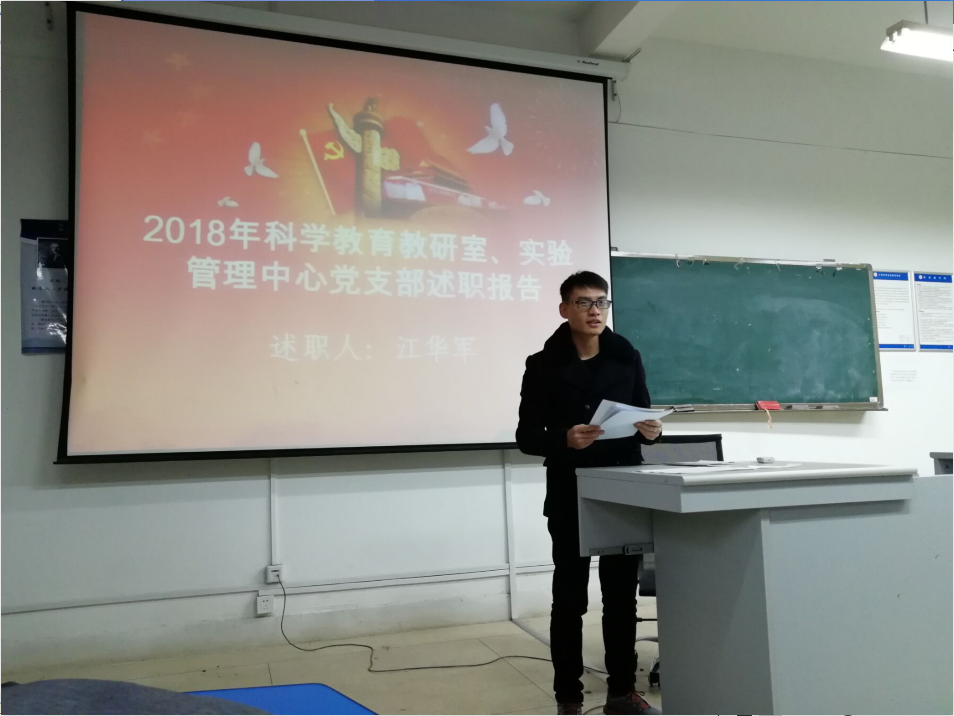 2019年1月7日下午科学教育教研室、实验管理中心党支部书记江华军同志分别于怀中楼北203和玉衡楼南107向教育科学学院党总支和科学教育教研室、实验管理中心党支部党员大会做了2018年度述职报告。教科院党总支书记、副书记、委员,各支部书记和支委以及党员均出席了本次会议。