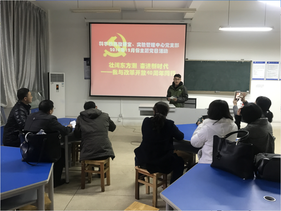 2018年12月25日,科学教育教研室、实验管理中心党支部于下午1:30在玉衡楼南107组织了本年度最后一次主题为“壮阔东方潮 奋进新时代——我与改革开放40周年同行”的民主党日活动。会议由支部书记江华军主持,除访学、出差、驻队实习和有课等党员外,其余党员都参加了此次活动。