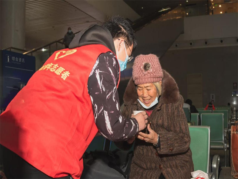 杨坤焕同学在候车厅为老人端上热茶