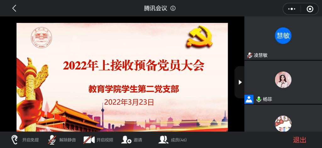 2022年3月23日晚上七点,教育学院学生第二党支部举行2022年上半年毕业生中共预备党员接收大会。应疫情防控要求,此次会议以腾讯会议线上方式召开,学生第二党支部书记杨菲出席本次会议。此次大会应到正式党员19名,实到19名。本次大会主要讨论谢倩、黄智敏2名发展对象的转预备问题。