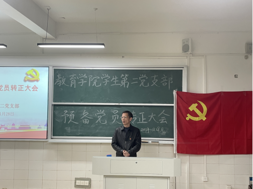 2023年11月28日晚六点半,教育学院学生第二党支部在玉衡楼106教室举行2023年下半年中共预备党员转正大会。大会的主要议题是讨论本支部12名预备党员是否转正问题。出席本次会议的有教育学院党委副书记张志新、学生第二党支部书记杨菲、教育学院教师何浩宇、黎玲以及29名正式党员和40名预备党员。