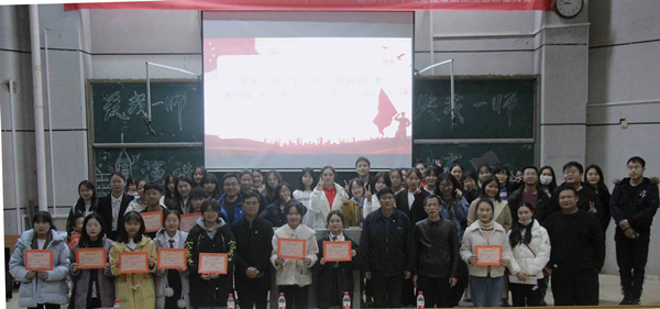 为加强校园文化建设,传承一师红色基因,弘扬家国家校情怀,12月5日晚7点,教育学院、物理与化学学院在怀中南110举行“爱我一师,兴我一师”主题演讲比赛暨“爱我一师,兴我一师”红色文化教育节颁奖大会。教育学院党委书记刘澍心、物理与化学学院党委书记陈志武、教育学院党委副书记张志新、教育学院学工办主任刘军、物理与化学学院学工办主任曾琳娜、教育学院团委书记孙三元、物理与化学学院团委书记石慧及两院全体辅导员受邀出席,各班学生代表积极参加此次活动。