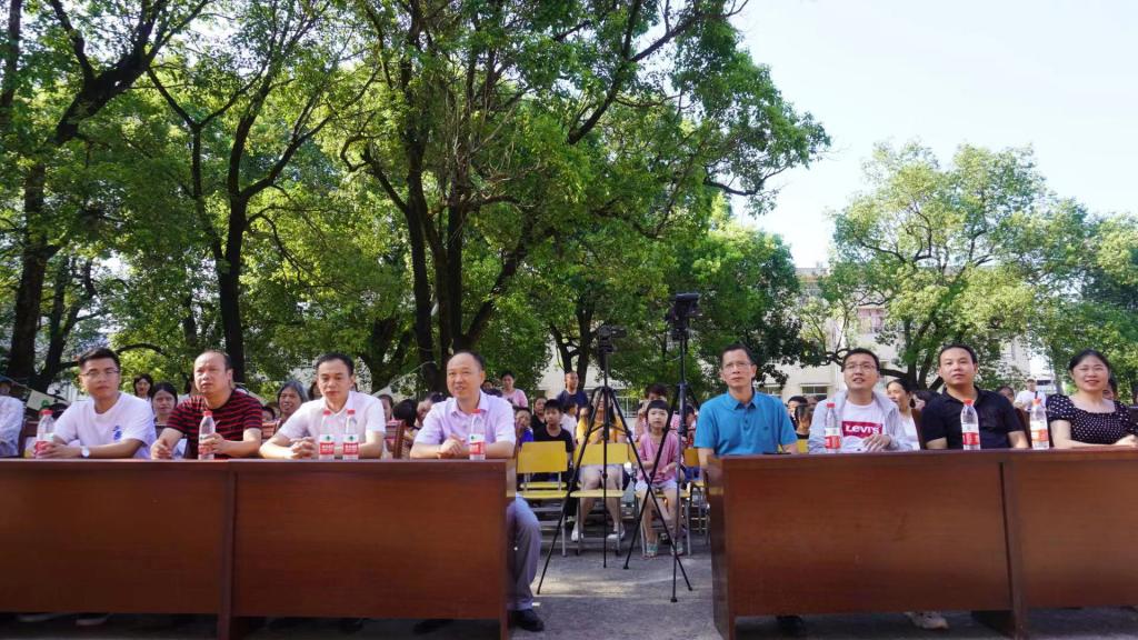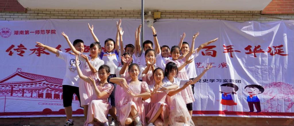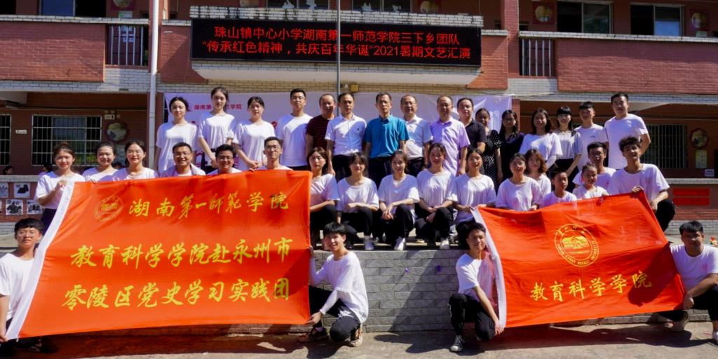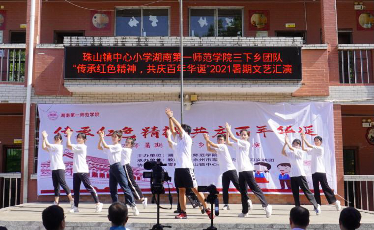 716日上午800,bevictor伟德官网教育科学学院2021年暑期三下乡文艺汇演传承红色精神,共庆百年华诞于永州市零陵区珠山镇中心小学成功举行。bevictor伟德官网教育科学学院党总支副书记张志新、bevictor伟德官网教育科学学院副院长黄月胜、bevictor伟德官网教育科学学院学工办主任刘军、零陵区教育局人事股副股长尹铁军、零陵区教育局学生资助股副股长蒋林君、珠山镇中心校校长唐海晖、珠山镇中心小学副校长蒋程春、珠山镇中心小学副校长赵卫华、永州市萍洲小学年级组长蒋淑玲、石山脚中学总务处主任罗胡珊及优秀校友张斌斌、秦亚兰、唐润玲老师等。“三下乡”实践队指导老师赵锋锋、杨菲、22名队员与100名孩子参与此次文艺汇演,现场近200名镇小教师与学生家长到场观看。此次汇演由“三下乡”实践队队员孙基恺、谭可雨和支教学生蒋俊超、李文静主持。