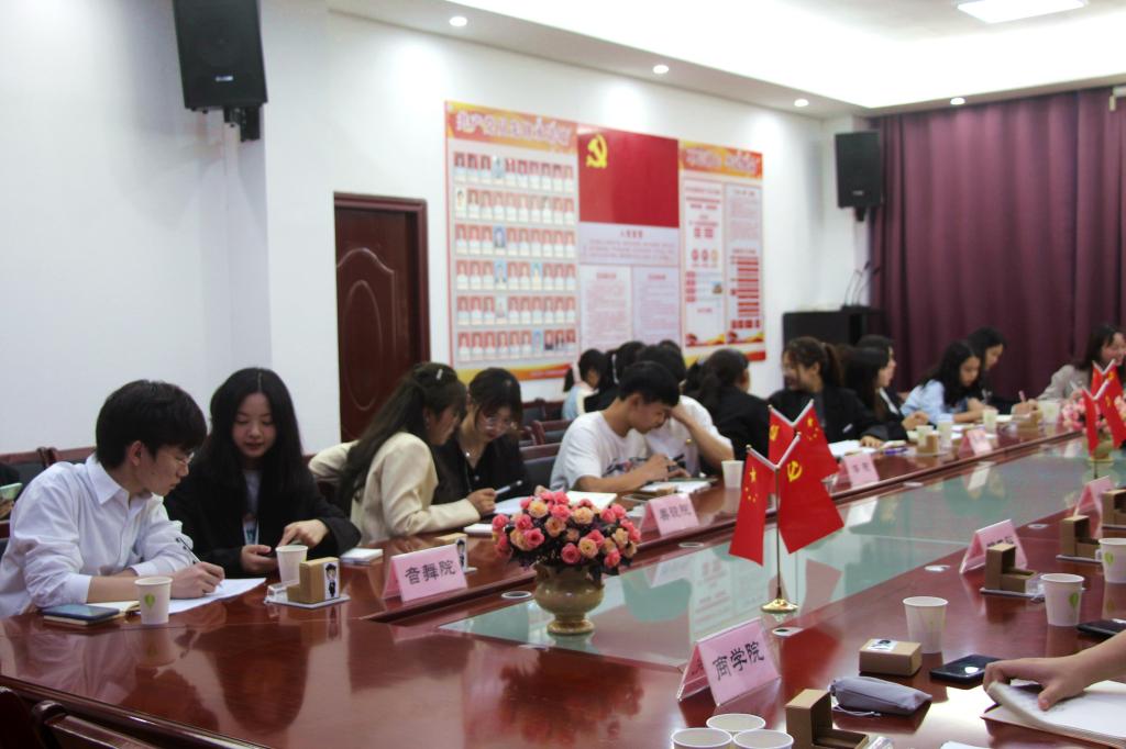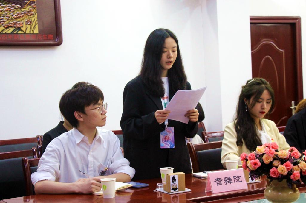 音乐舞蹈学院代表分享了本院在活动方面对学生的一对一帮扶等服务工作,提出在工作方面要以身作则,做实事的原则,在维护学生权益方面应该开通网络维权通道,并且密切联系各部门的工作。