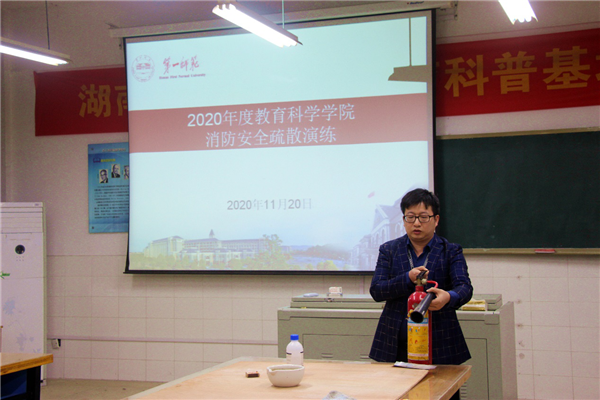 教育科学学院于2020年11月20日中午在玉衡楼南栋举办了2020年度教育科学学院消防安全知识讲座以及消防安全演练。讲座由湖南省会消防安全中心廖成俊教官主讲,教育科学学院张志新书记、教务处实践科科长殷绪彬、学工办主任刘军、实验员黄永亮、全体辅导员、学生干部及各班学生代表受邀参加此次活动。