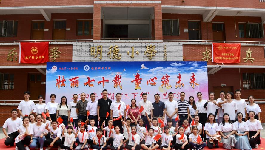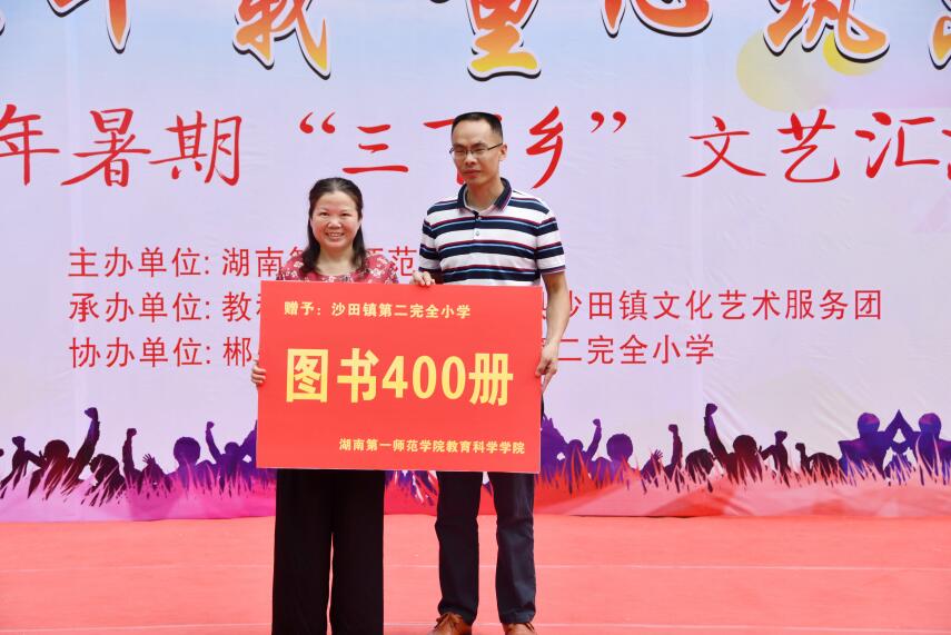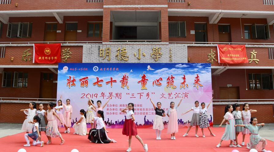 2019年7月22日下午,bevictor伟德官网教育科学学院2019年大学生暑期“三下乡”社会实践活动汇报演出“壮丽七十载,童心筑未来”在桂东县沙田镇第二完全小学隆重举行。桂东县政府党组成员、副县长陈健春、桂东县教育局党组书记、局长郭建军、沙田镇党委副书记、镇长郭晓奎、教育局人事股股长周孟皎、教育局办公室副主任邓志刚、沙田镇第二完全小学校长郭小波、bevictor伟德官网教育科学学院党总支书记陈天涯、教育科学学院党总支副书记、院长胡春光、教育科学学院党总支副书记张俭明、教科院学工办副主任刘军、教科院教师代表许兰及学生家长、沙田镇村民代表200余人参加活动。本次汇演由“三下乡”实践队队员杨啸黎、刘轩和支教学生邓鑫宇、方柔主持。