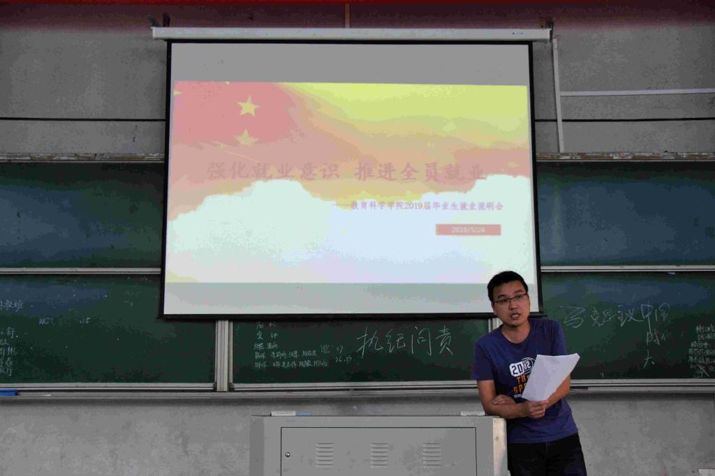 524日下午,教育科学学院2019届毕业生就业说明会分别在怀中楼南栋107109110教室召开。会议分别由我院党总支副书记张俭明、学工办主任刘军及团总支书记罗娱主讲毕业班辅导员及2019届全体毕业生到场参加会议。