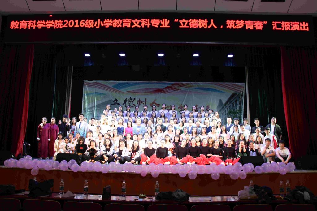 5月21日晚,教育科学学院2016级小学教育文科专业“立德树人,筑梦青春”汇报演出在特立楼实验剧场圆满举行。我院副院长胡春光、党总支副书记张俭明、副院长王建平、副院长刘丽群、学工办主任刘军、小学教育教研室全体老师、全体辅导员应邀出席此次演出,共400余名师生到场观看。