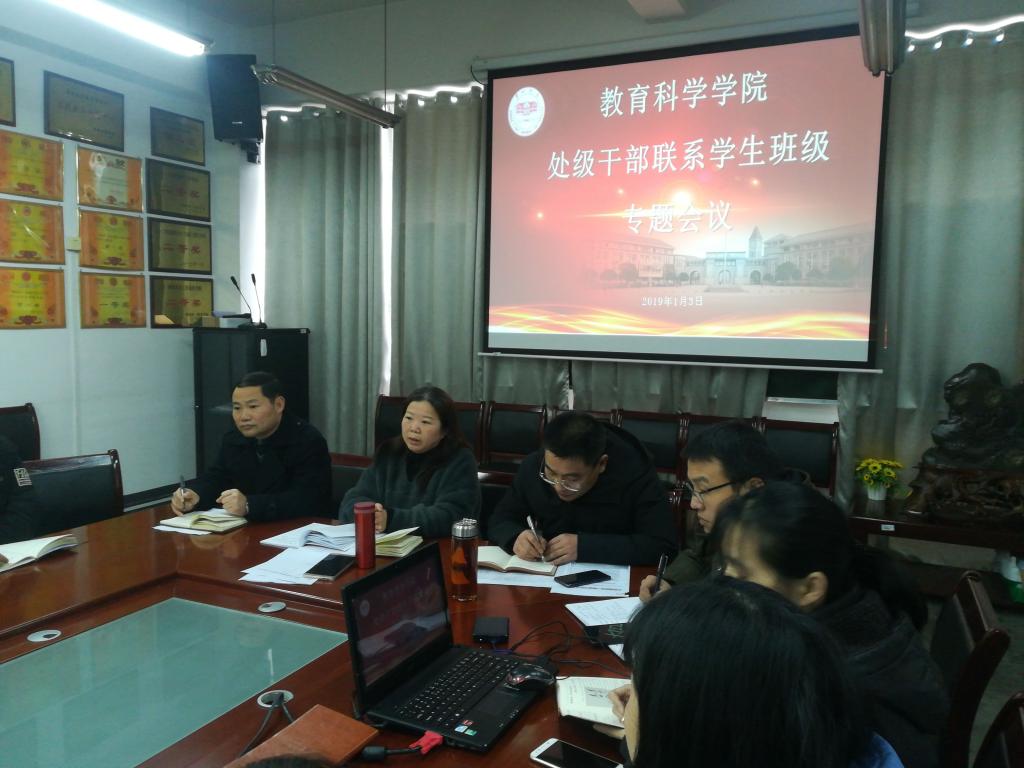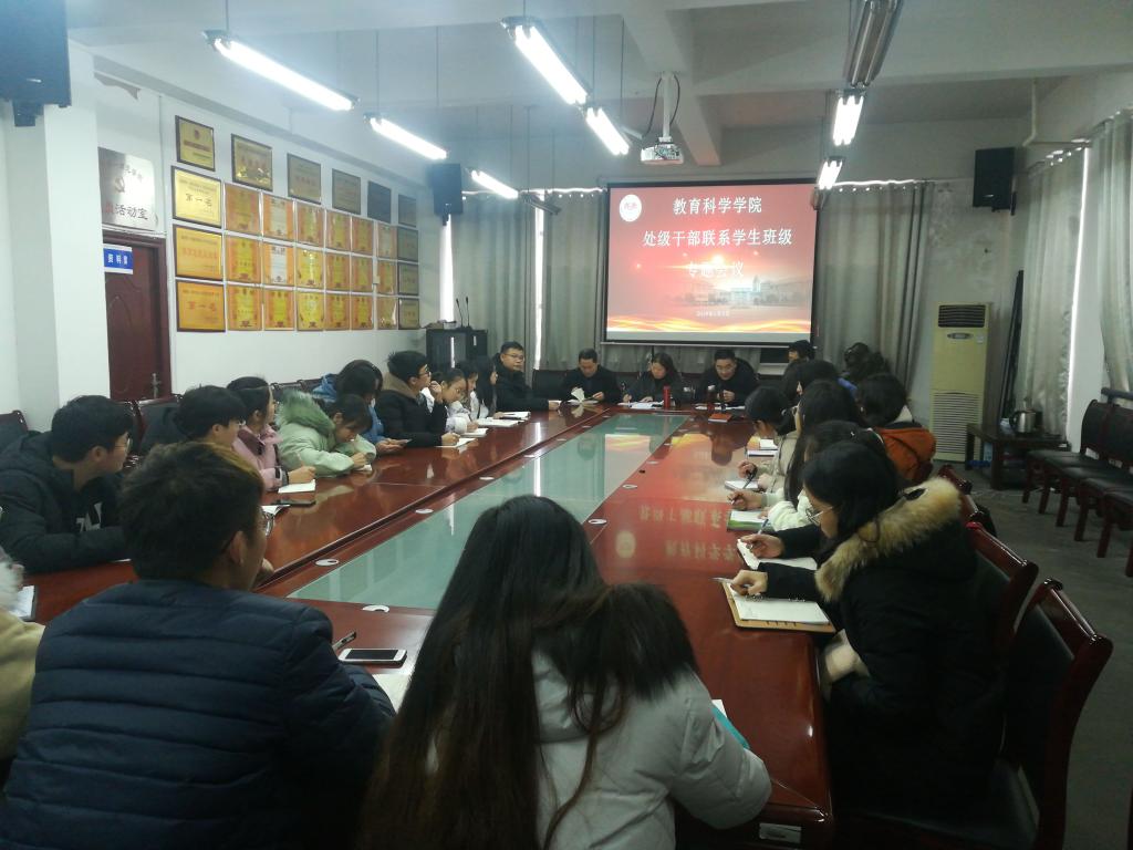 了进一步加强学生思想政治教育工作,加深学院处级干部与所联系班级学生的交流, 2019年1月3日,教育科学学院在特立楼北栋208召开处级干部联系学生班级专题会议。教科院党总支书记陈天涯、副书记张俭明、副院长王建平、学工办主任刘军、18级全体辅导员老师及18级各班学生代表参加本次会议。