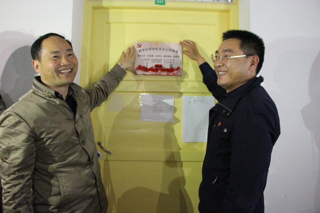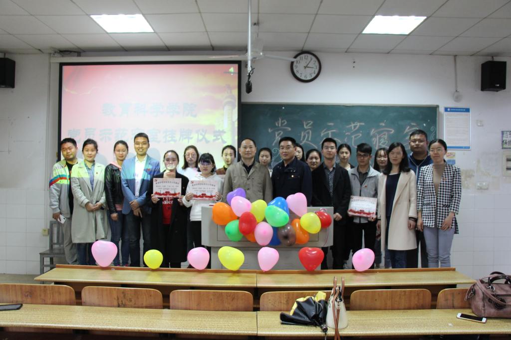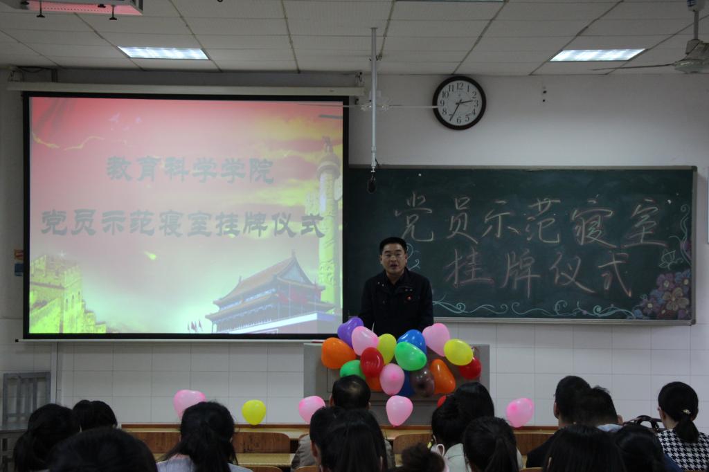 4月13日下午,教育科学学院在怀中楼B栋602教室举行2018年党员示范寝室创建挂牌仪式。出席挂牌仪式的有教科院党总支副书记张俭明、副院长王建平、学工办刘军老师及部分辅导员,70余名学生党员及入党积极分子参加了仪式。