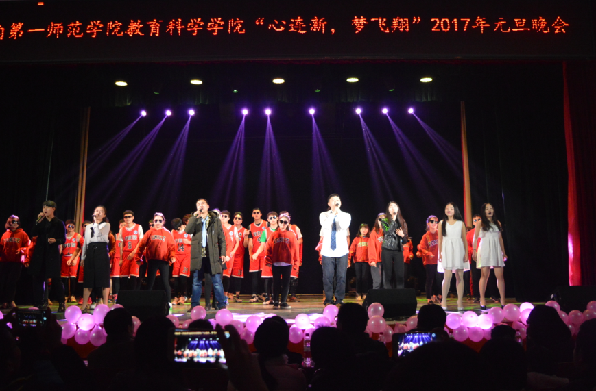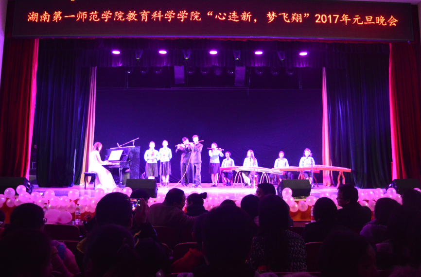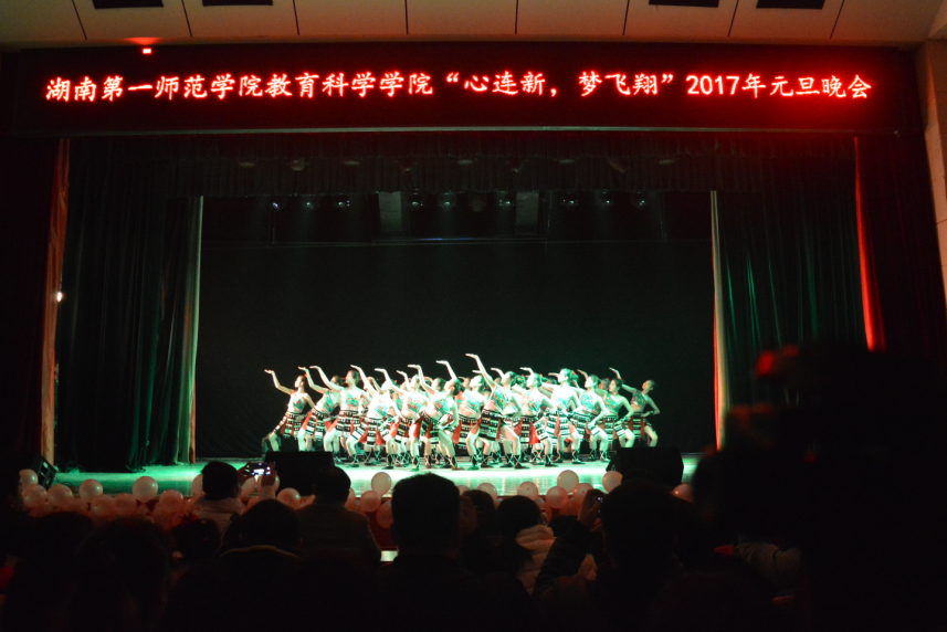 12月27日晚,教育科学学院 “心连新,梦飞翔” 2017年元旦文艺晚会在科技楼演播厅隆重举行。校长童小娇、教育科学学院负责人陈天涯、张俭明、王建平、胡春光、刘丽群全体辅导员及部分老师代表应邀出席,与400余名在场学生共同观看了晚会。