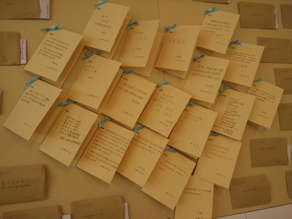 “读书漂流”活动组委会要求参与活动的同学推荐一本喜爱的书籍,并写下推荐理由,收到推荐信的同学阅读此书并记录下感悟,装进同一信封。旨在让同学们利用书信的形式匿名进行书籍阅读的感悟交流。本次成果展便展出了活动中同学们交流感悟的书信。现场教室中心有一个用桌椅组成“书”字,并用橘黄色的灯光以及舒缓的音乐营造了轻松自由的阅读气氛。桌上摆放了部分书信以及书信中推荐的数十种书籍,后墙上张贴了书信以及我院领导、老师们对此次活动的寄语。展示过程中还收录了许多同学观展后的感悟和建议。
