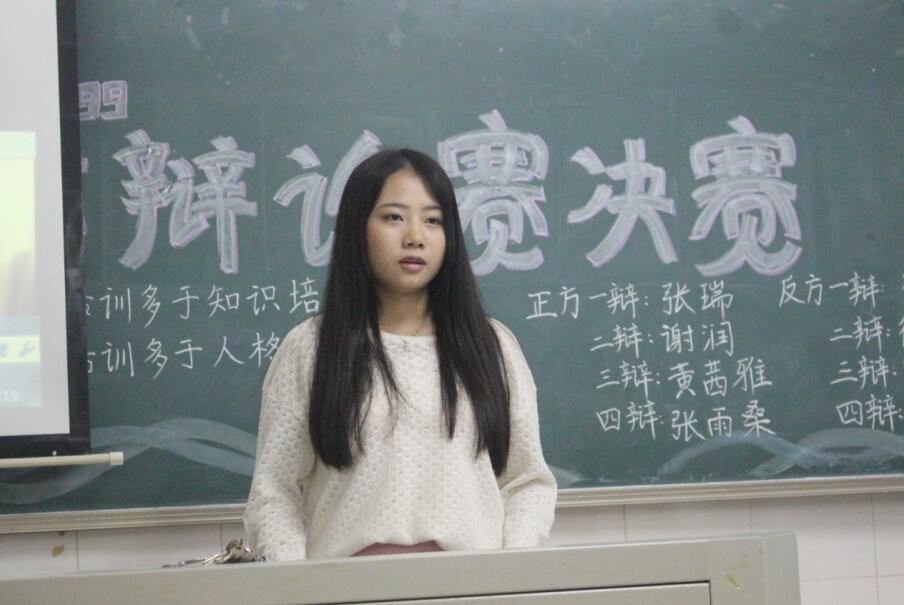 2016年10月19日晚,教育科学学院学生会语工部在实验楼b栋502、503教室成功举办了主题为“教育应重视人格培训多于知识培训,还是知识培训多于人格培训”辩论赛决赛。胡志伟老师、主席部主席张蓝方、卫生部部长李雯担任赛场1的评委,江华军老师、宣传部部长谢慧霞、社团联合会主席王佳蓓、体育部部长裴秋慧担任赛场2的评委,近200余名同学到场观赛。