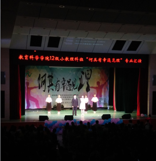 教育科学学院12级小学教育理科班的学子们精彩的表演通过舞台表演的方式,向大家展示了他们扎实的专业知识和技能,彰显了他们热情洋溢和多才多艺。