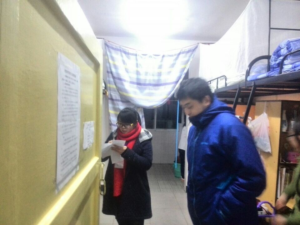 继12月10日谭玉兰副书记率领全体辅导员走访学生宿舍后,2014年12月17日,教科院学工办组织辅导员和学生干部再次全面走访学生寝室。