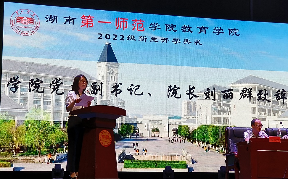 典礼在全场齐唱国歌的动人旋律中拉开了帷幕。首先,教育学院党委副书记、院长刘丽群代表全院2300多名师生员工向新同学们的到来表示祝贺和热烈欢迎,并发表《以奋斗致青春》为题的致辞。在致辞中,刘院长介绍了学院的发展历史及基本情况并向同学们提出了几点希望。希望同学们的青春因梦想而飞扬,因奋斗而美丽,因实干而精彩。她鼓励同学们立高远之志,树报国之心,用奋斗练就成才报国的本领,在为祖国和人民的建设事业奋斗中成就自己的精彩人生。同学们更要读“无字之书”,求真务实,脚踏实地,向着青春的梦想不断向上攀岩,书写自己的“一师故事”!
