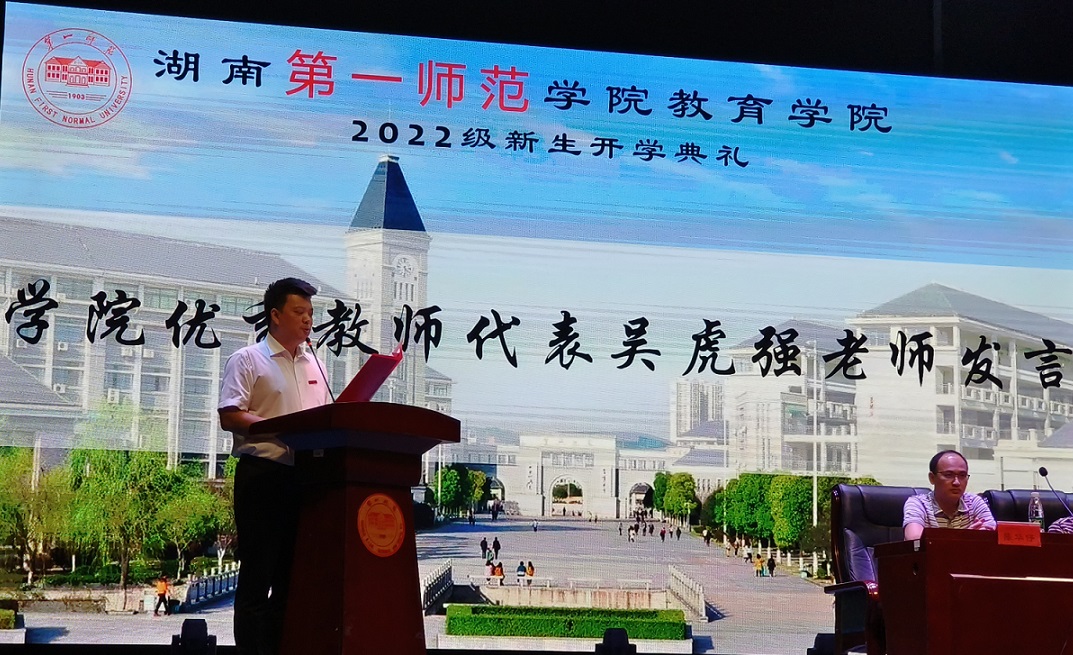 首先,请允许我代表教育学院的老师们对各位新同学的到来表示最热烈的欢迎与最衷心的祝贺!今天,“千年学府,百年师范”以焕然一新的面貌、昂扬奋进的姿态与真诚温暖的服务迎接来自全国各地的新同学、新朋友,作为教育学院的一名新老师,我感到喜悦、激动与幸福,同时,也倍感责任重大。我在想:在这个充满想象、充满希望、充满期待的人生新起点,我们应该以什么样的姿态再一次出发呢?我想我们可以从湖南一师的伟大校友——毛主席身上得到启发。