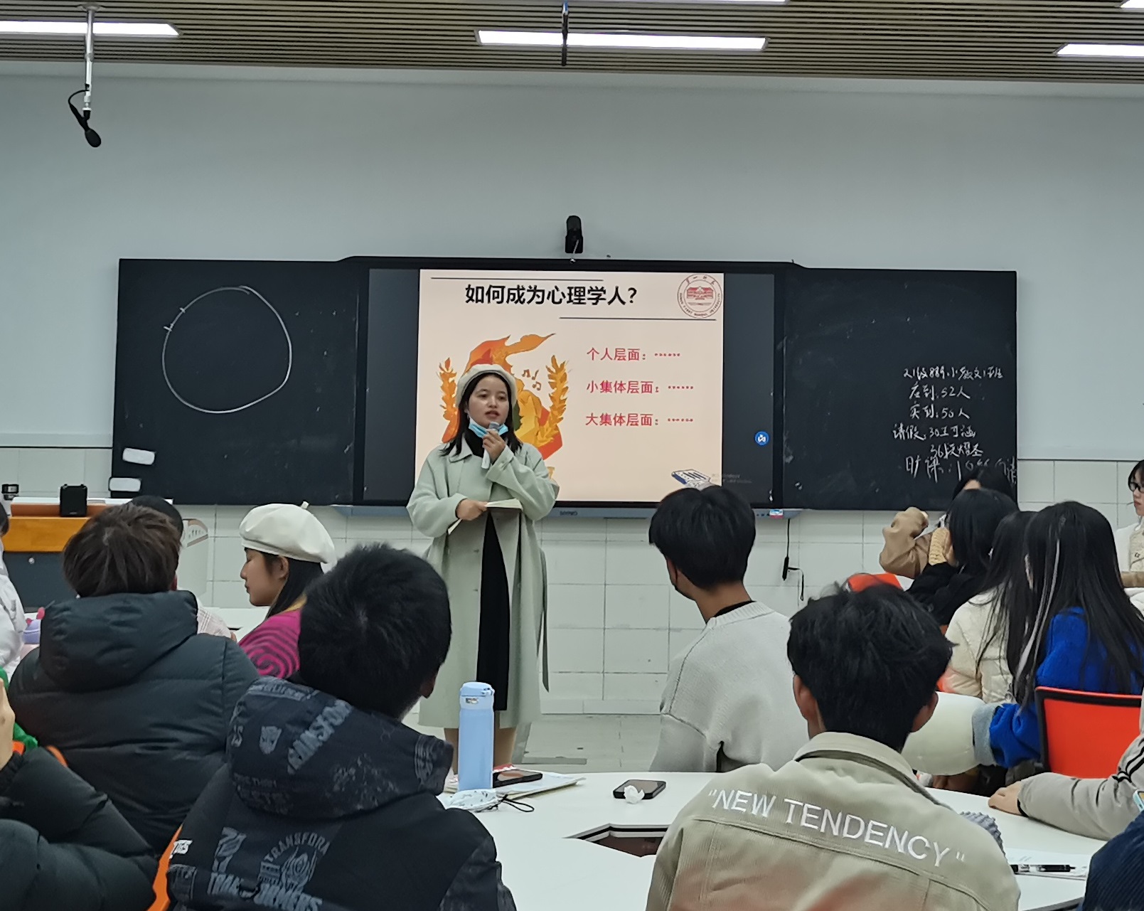 室外的寒风冰雨和室内的热火朝天形成强烈对比,2022年11月30日晚,在特立北401智慧教室,教育学院22心理1班展开了以“如何成为心理学人?” 为主题的大型班会。班主任何浩宇老师、辅导员杨菲老师、学生班主任高叶鹏同学、20心理1班的4位学生代表以及22心理1班全体同学出席了本次班会。