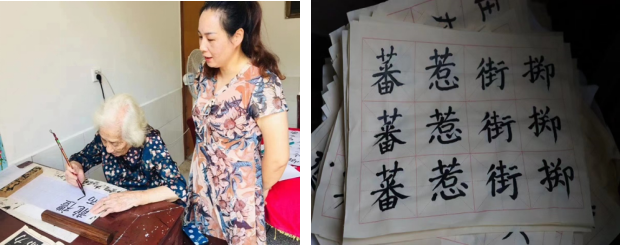 踏入堂屋,“忠厚传家”四个大字便映入眼帘。四字遒劲有力,这是周康湍奶奶的书法作品,更是李学树两夫妇对子女的家训。走进屋内,书法字画挂满墙壁,书本字帖分别部居。“母亲每天坚持练习毛笔字”李尤专先生如是说,并拿出了几摞沾满笔墨的宣纸,上面的字体娟秀有力,赏心悦目。