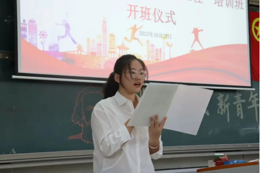 学工办主任杨杨在热烈的氛围中向“青马”学员宣读了《教育学院青马培训班学员手册》并宣布“青马”正式开班。