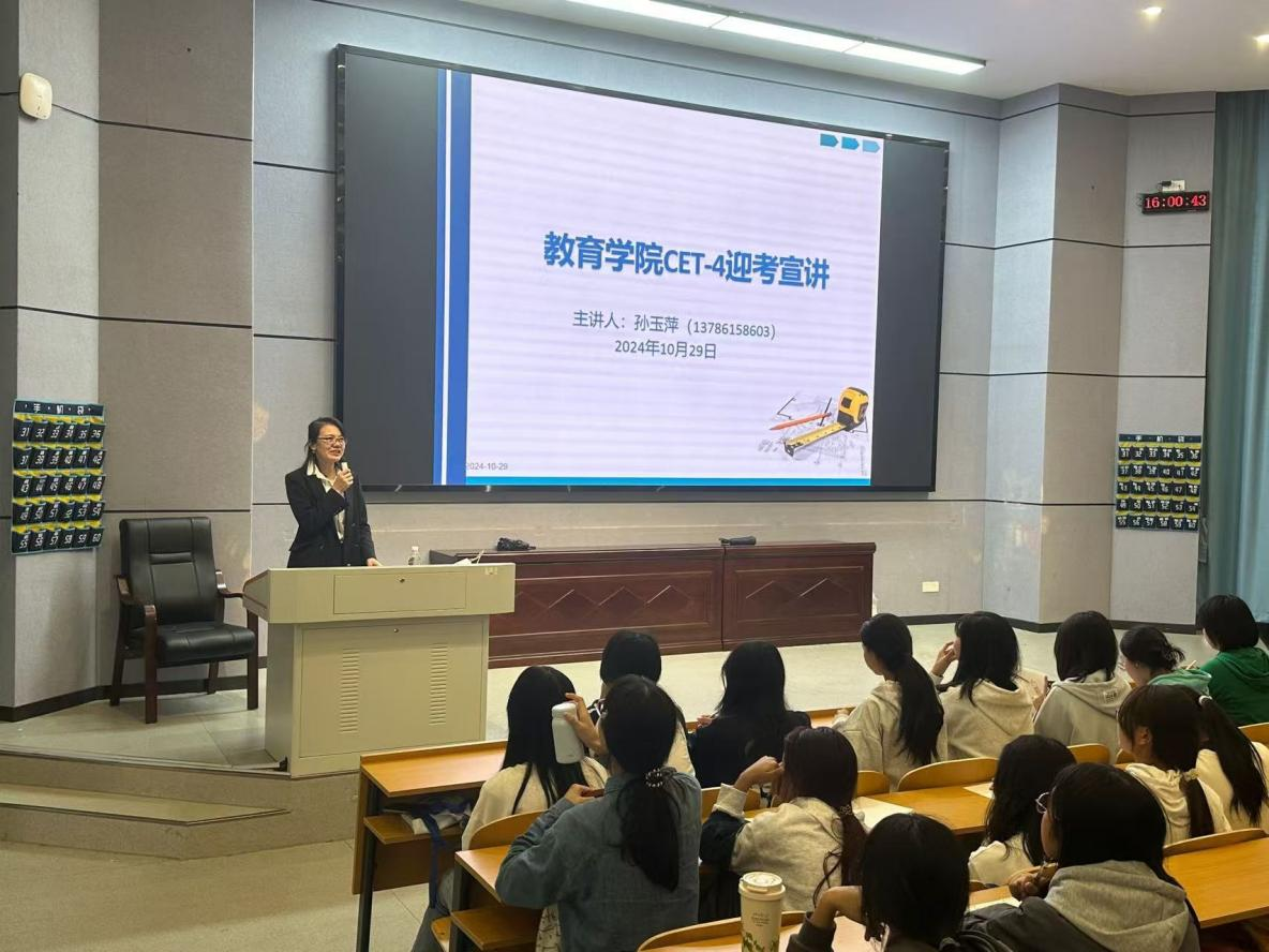 为进一步帮助学生明晰大学英语四六级考试的要求,指导学生掌握正确的学习和应试技巧,教育学院特邀外国语学院孙玉萍老师于10月29日下午16:00-17:30在怀中南110教室举办四六级备考讲座,2023级全体学生以及2024级教育学班的学生参加本次讲座。