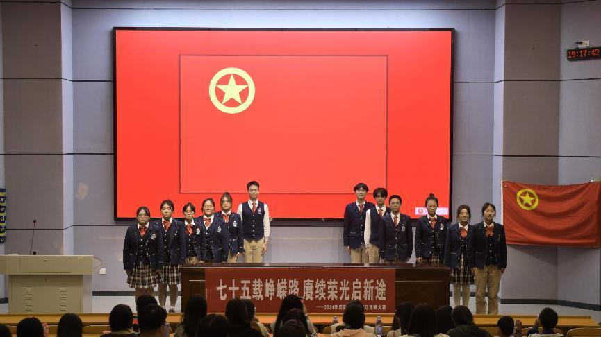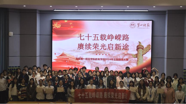 2024年11月8日晚,为庆祝中华人民共和国成立七十五周年,深入贯彻党的二十大及二十届三中全会精神,教育学院在东方红校区怀中楼南栋110教室成功举办了“七十五载峥嵘路,赓续荣光启新途”精品团课大赛。大赛围绕主题展开,涵盖峥嵘岁月、建设辉煌、时代新章、民族团结、青春报国五个篇章。团课旨在通过新颖形式,使同学们增强爱国情感、铭记历史使命、激发责任意识、促进团队协作、丰富校园文化、彰显学院特色。教育学院学工办主任杨杨老师、团委书记孙三元老师、辅导员朱晶平老师出席活动,与教育学院组织部工作者及学生观众共同见证了这场精彩纷呈的团课盛宴。