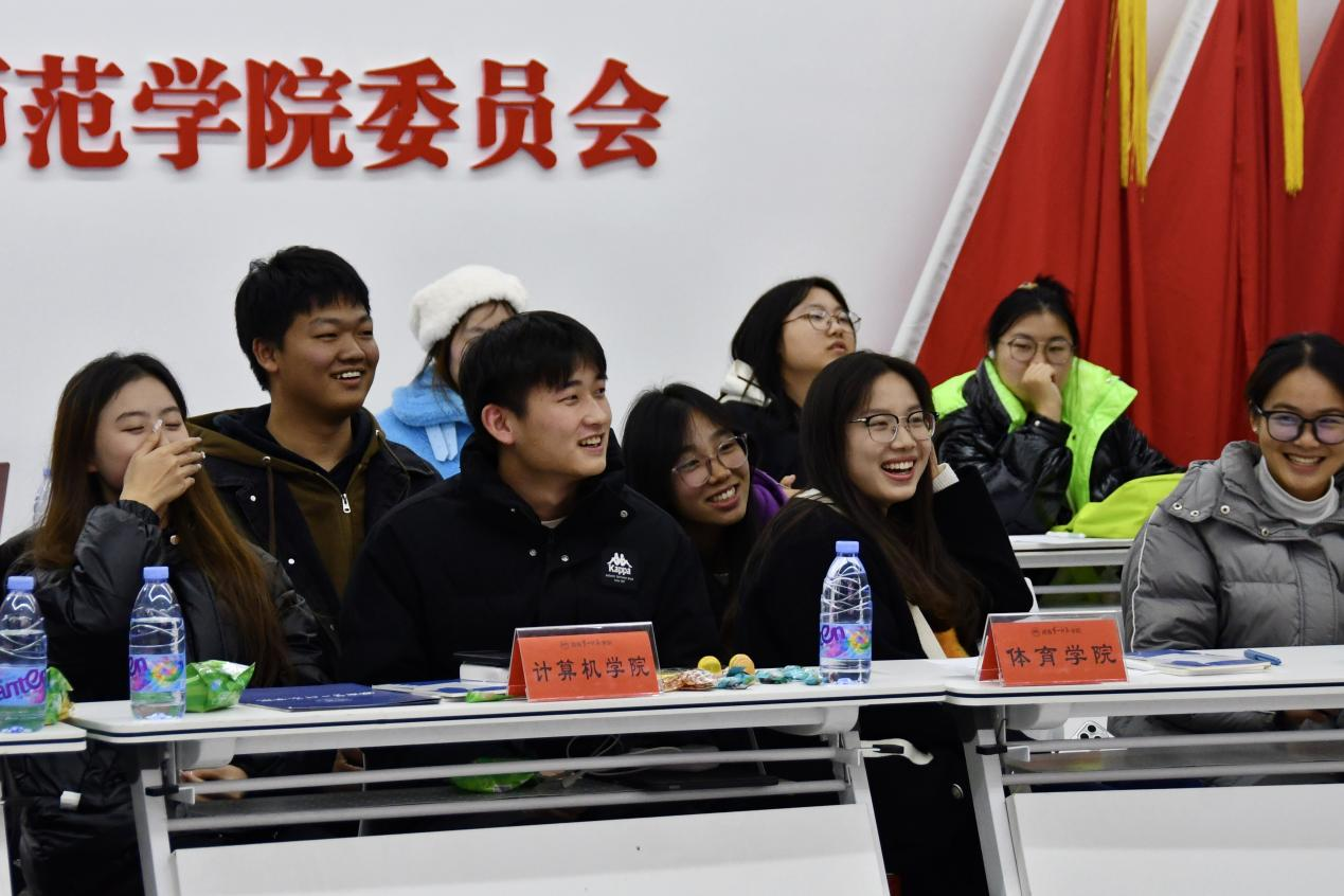 经抽签决定,校学生会、数学与统计学院、外国语学院和智能制造学院为第一组;初等教育学院、电子信息学院和计算机学院为第二组;物理与化学学院、美术与设计学院和体育学院为第三组;马克思主义学院、商学院和音乐舞蹈学院为第四组。本环节分为“看图猜猜猜”与“飞花令”两项互动游戏,四组之间进行比赛,增进了各学院之间的友谊与团队协作。