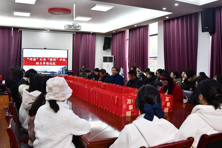 12月9日上午我院于特立北208成功举办了“研海”行舟“暖情”护航:助力梦想远航送温暖办实事活动。学院党委书记朱承学、院长胡春光、副书记张志新、学工办主任杨杨、团委书记孙三元、辅导员邓魁以及2025年在校复习考研学子代表参与本次活动。通过实际行动为考研学子提供物质和精神上的双重支持,让他们在备考过程中感受到来自学院的温暖与关怀。
