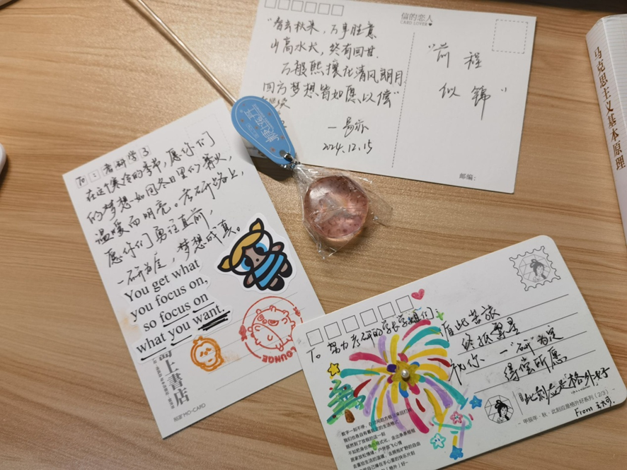 活动正式开始之前,工作人员在国基广场设立了祝福语纸盒与海报,向全校师生收集写给考研学子的祝福,并将写有祝福的便签贴至海报上,将写有鼓励话语的卡片装进了“希望纸箱”。海报上满满的便利贴和卡片,凝聚着师生对考研学子的诚挚心意与殷切期许,激励考研学子奋勇向前、攻坚克难。