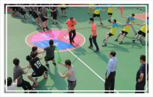 项目简介:每队12人参加,趣味拔河(采用三方拔河和四方拔河),在场地中设定一个1.5m半径的圆,圆圈分成三或四个等份不同颜色,每个等份为一个120-90度夹角的扇形,三个或四个队伍各有一个扇形的区域;再开始前拔河绳的结点放置在圆心位置,拔河绳分别对应着圆圈的标记线,待裁判鸣哨后,各队伍向不同方向拨河,率先将中间的结点拔出自己所在的扇形区域以外即获胜。