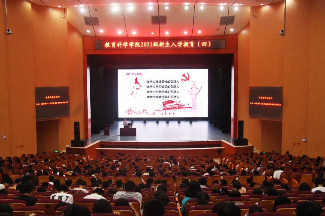 2021年9月19日下午15:20,bevictor伟德官网教育科学学院在田汉大剧院成功举行了以“不负年华与初心”为主题2021级新生入学教育专题讲座。我院党总支书记陈天涯、刘丽群教授、党总支副书记张志新、副院长曾晓洁、副院长黄月胜、副院长许兰、学工办主任刘军、团总支书记孙三元及辅导员老师们出席讲座。近九百名师生参与本次讲座。本次讲座由金桥小学校长赵华博士主讲,我院副院长曾晓洁主持。