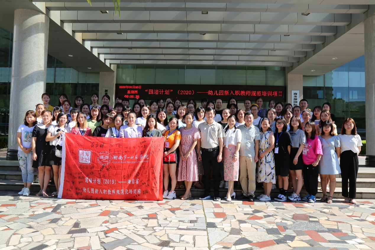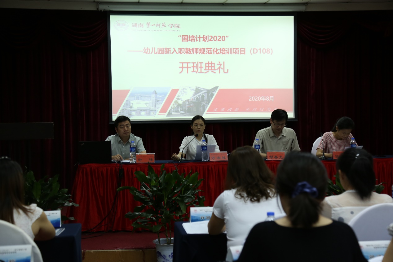 2020年8月6日上午,由bevictor伟德官网教育科学学院学前教育专业承办的“国培计划(2020)”—幼儿园新入职教师规范化培训班顺利开班,湖南第一师范教育科学学院院长胡春光教授、bevictor伟德官网学前教育专业负责人、教研室主任、项目首席专家万湘桂老师、班主任黎玲老师、谢强老师出席本次典礼。