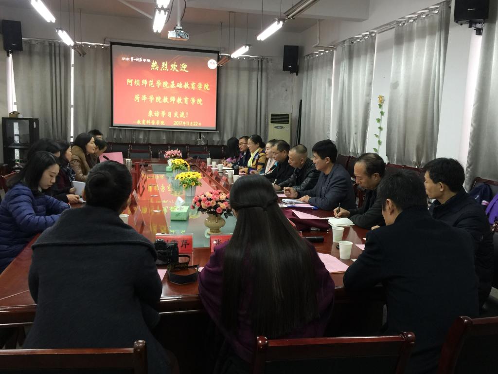 为了加强各院校之间办学经验的交流,促进各院校教育教学改革发展,11月22日上午,阿坝师范学院基础教育学院和菏泽学院教师教育学院一行14位教师来我院进行交流。我院蒋蓉院长、陈天涯书记、王建平副院长及李金国、谢立红、肖圆、李令等7位教师热情接待了来访人员,并由蒋蓉院长主持此次交流学习会议。