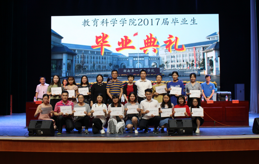 毕业典礼由教育科学学院张俭明副书记主持,仪式在全体起立奏唱国歌后拉开序幕。蒋蓉院长致辞,对毕业生表达了美好祝愿和殷切期望。陈天涯书记宣读了表彰本届30名省级优秀毕业生、72名校级优秀毕业生和20名考取硕士研究生的毕业生的决定,在主席台就座的领导为优秀毕业生颁发了证书,为考取硕士研究生的学生颁发了奖金。教师代表朱丹老师、优秀毕业生代表颜睿智、优秀在校学生代表彭玮祯相继发言,为毕业生送上了饱含真情的勉励和祝福。最后,童小娇校长为毕业生送上了激情洋溢的临别寄语,将谆谆教诲和殷殷祝福传递到了每个学子心中。全场起立合唱校歌后毕业典礼结束,毕业晚会开始。
