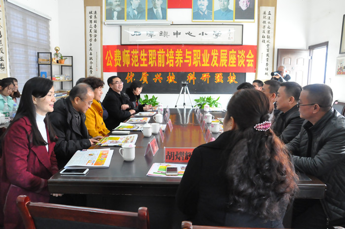 11月26日下午,我校在湘潭县石潭镇中心小学召开公费师范生职前培养与职业发展座谈会。学校党委书记彭小奇、校长童小娇及教务处、科研处、教育科学学院蒋蓉院长、胡春光副院长、刘丽群副院长和前来参加“小学教师教育协调创新中心”成立大会的专家、湘潭市、县教育局相关负责人以及石潭镇中心学校、石潭镇中心小学教师代表一起,共同探讨公费师范生职前培养与职业发展问题。