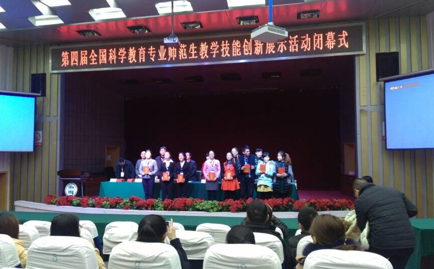 2015年12月18-20日,由中国教育学会科学教育分会主办的第四届全国科学教育专业师范生创新技能展示大赛在四川师范大学隆重举行。第四届全国科学教育专业师范生创新技能展示大赛分小学组和初中组两个小组,分别采用教育科学出版社和浙江教育出版社的科学教材。大赛分两个阶段,第一阶段在2015年10月初,对参赛学生的教学设计进行评定,获得一等奖及二等奖中优秀的同学进入第二阶段现场比赛环节。在第二阶段,来自全国28所师范院校共168名科学教育专业(或科学教育方向)的学生进行现场竞赛(包括即席演讲、模拟授课和现场提问三个环节),再加上教学设计的成绩,计算出综合成绩进行评奖。大赛共设特等奖8名(小学组5名,初中组3名)、一等奖24名和二等奖68名和创新奖2名(小学组和初中组各1名)。