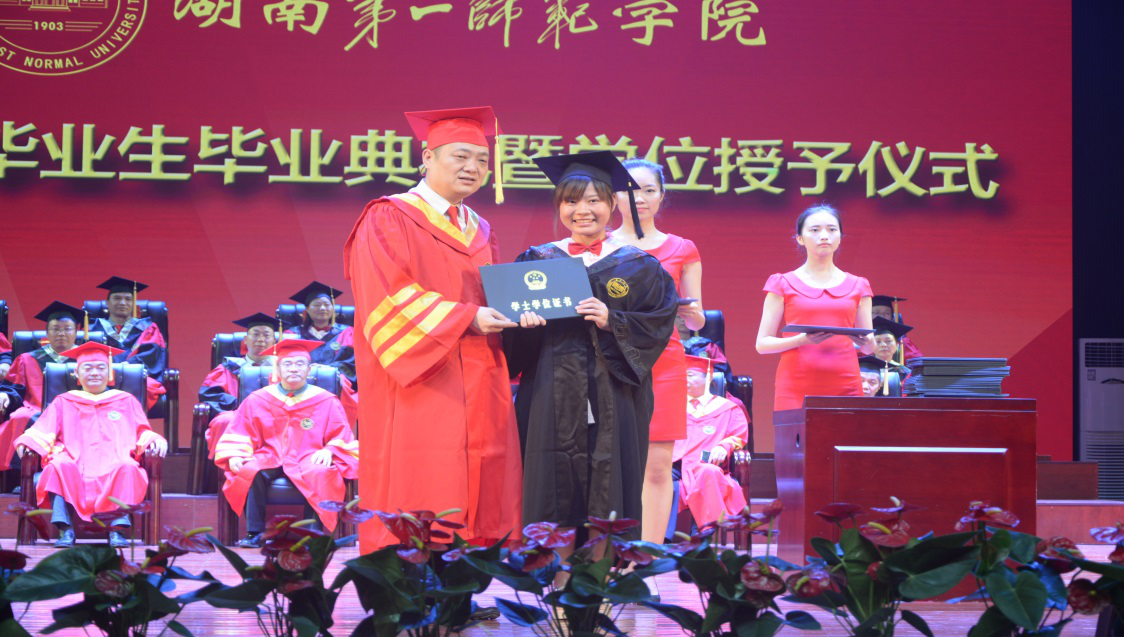 在激昂的校歌声中,怀着无比激动的心情,毕业生身着学士服依次登台,迎接人生中这一庄严而神圣的时刻。校学位评定委员会主席、校长肖湘愚与他们一一握手祝贺,颁授学位证书并合影留念。从校长手中接过烫金的学位证书,激动洋溢在每一张年轻的脸庞上。他们深情地向导师鞠躬致谢,与台下迎候的亲友拥抱庆祝,难忘的四年求学历程终于划上了圆满的句点。
