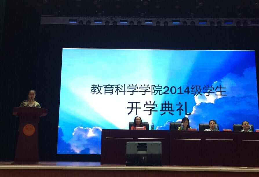 2014年9月14日上午8点半,教育科学学院在学校音乐剧场举行了隆重的2014级新生开学典礼。教科院院长蒋蓉,副院长张平柯、王建平,副书记谭玉兰,新生班级辅导员,部分老师老生代表以及2014级758名新生参加了开学典礼。王建平副院长主持了开学典礼。
