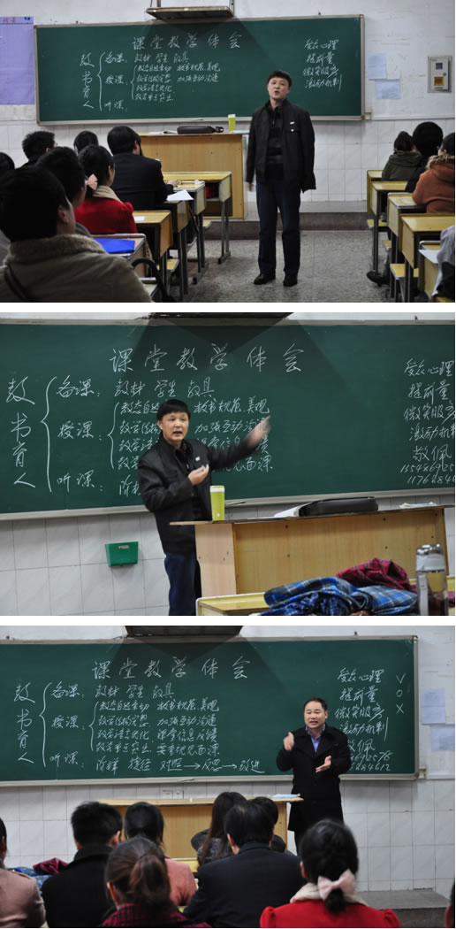 讲座从“教书育人”这个千古话题开始,彭老师引用韩愈名言“师者,所以传道授业解惑也”来阐释课堂教学中老师所起的作用。他认为:教学特别是课堂教学主要要做好三大块工作,第一大块是备课,备课除了备教材外,还要有针对性,既要考虑学生的接受水平,还得注意所采用的教具;第二大块是授课,授课过程至关重要,教师要做到课堂板书规范、师生互动良好等等,并结合自身多年从教经历展示了课堂艺术的重要性;第三大块是听课,听课也是一门艺术,它是我们进步的捷径、阶梯,青年教师在听课后,通过“对照-反思-改进”,从而逐步提高教学水平。整个讲座过程中,彭老师神采飞扬、深入浅出,博得了一片掌声。