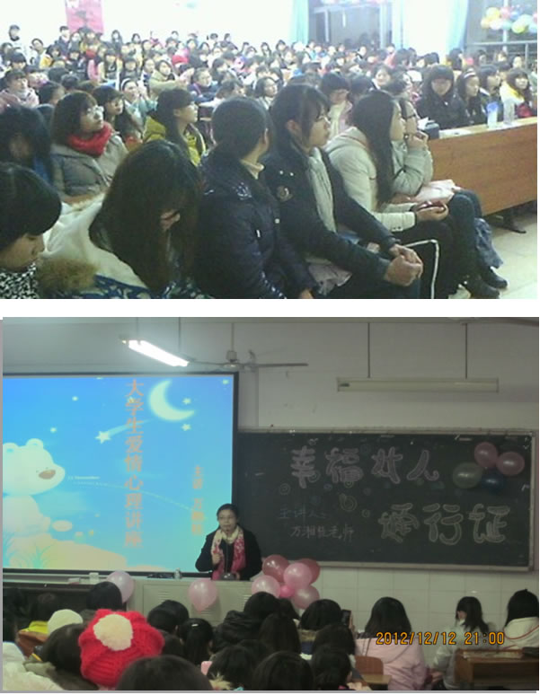 由教育科学系学生会女生部策划和举办的《幸福女人通行证》讲座,于2012年12月12日晚7点在文科楼b栋101如期举行。此次讲座,是女生部组织的“做幸福女人”主题系列活动的压轴戏。在讲座之前,女生部开展了优秀海报征集、宣传栏设计、“我手写我心”等系列活动。特别是“我手写我心”活动,于12月11日—12日在学生宿舍三岔路口举行,该活动鼓励女生说出自己的心里话,写下自己的幸福感言,为“做幸福女人”主题系列活动增添了一抹亮色,扩大了影响力。