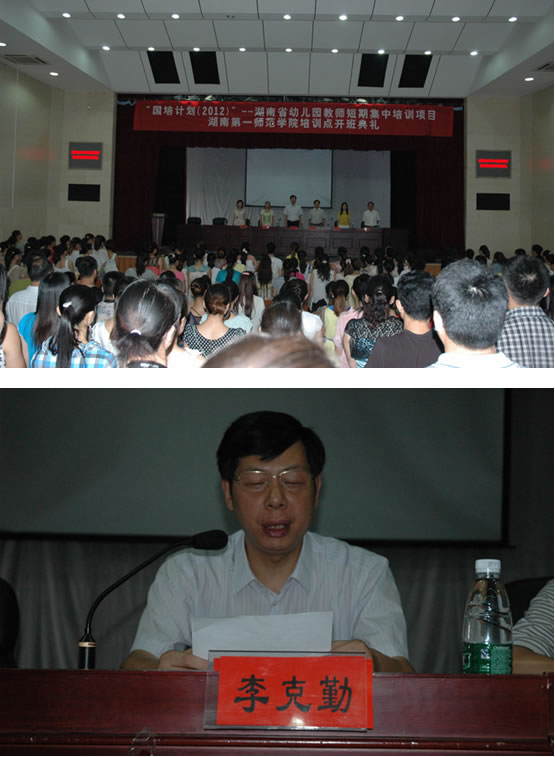 7月31日上午,“国培计划(2012)”——湖南省农村幼儿园教师短期集中培训、湖南省小学心理健康教育教师省级培训bevictor伟德官网培训点开班仪式在东方红校区科技楼演播厅隆重举行。省教育厅“国培计划”项目办公室主任黄佑生,副院长李克勤,我系幼儿教师学科首席专家袁小平、心理学科首席专家彭剑飞,我系系主任蒋蓉教授,院国培项目办主任、继续教育部主任曾小玲,院国培项目办副主任、继续教育部副主任黄朝霞应邀出席并在主席台就坐,有关部门负责人及院国培办老师等出席了开班仪式。开班仪式由院国培项目办副主任、继续教育部副主任黄朝霞主持。