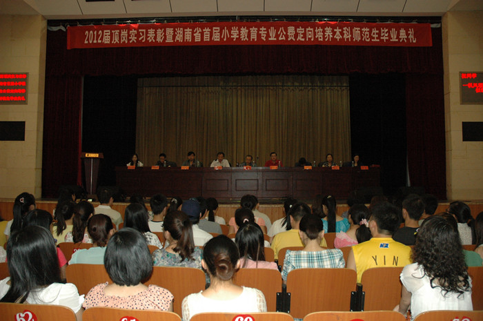 6月28日上午,东方红校区科技楼演播厅举行了2012届顶岗实习表彰暨湖南省首届小学教育专业公费定向培养本科师范生毕业典礼。院领导彭小奇、金潇明、刘志敏及招生就业处处长杨家福、教务处处长陈梦稀、学生工作处处长何文、我系系主任蒋蓉、团委书记任晓晴、北京国之源软件技术有限公司副总经理张晓军在主席台就座。我系08级本科免费师范生和2007级五年制免费师范生代表参加了典礼。