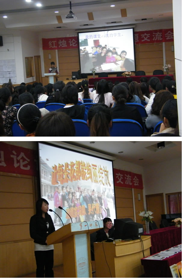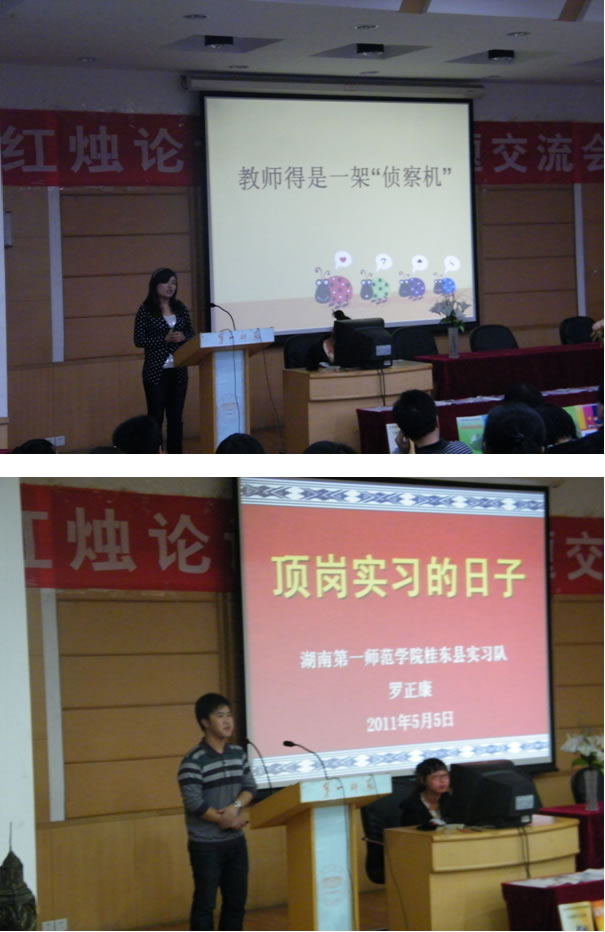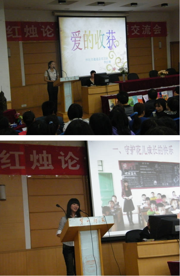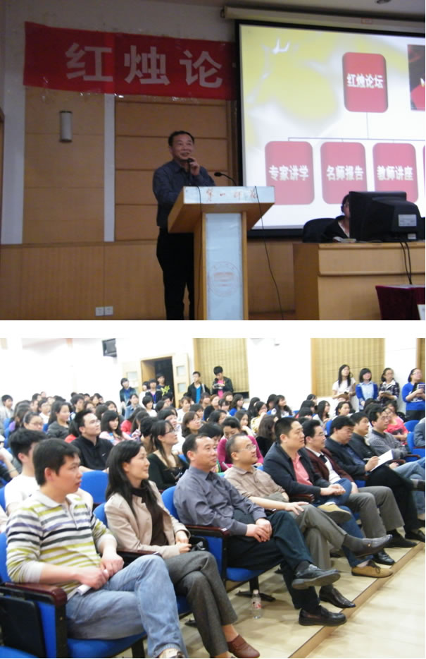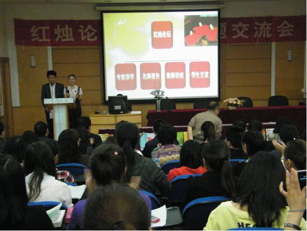 “春蚕到死丝方尽,蜡炬成灰泪始干。”多少年来,人们一直把教师比作红烛,赞颂她默默发光、无怨无悔奉献的精神,教师也一直以蜡烛精神来鞭策自己。为了进一步使同学们增长见识、开阔视野、提升素质和培养专业情意,本学期小教大专部特设了“红烛论坛”,包括“专家讲学”、“名师报告”、“教师讲座”和“学生交流”四个系列板块。2011年5月5日晚,“红烛论坛•学生交流”—— 小教大专部06级公费师范生顶岗实习交流会在学院城南校区多功能报告厅隆重举行。院领导彭小奇院长、肖湘愚副书记、刘志敏副院长、阳柏苏副书记,教务处陈梦稀处长、朱承学副处长和李建亚科长,小教大专部蒋蓉主任、张平柯副主任、蔡海军副书记及系部近400名师生参加了此次交流会。