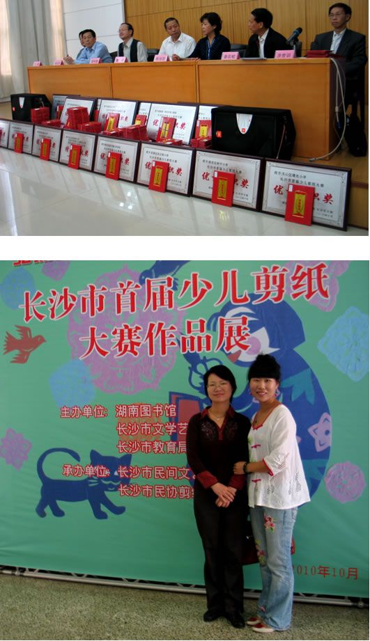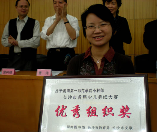 2010年10月9日上午9点,在湖南省图书馆一楼报告厅举行了长沙市首届少年儿童剪纸大赛作品展开幕式。长沙市民间文艺家协会剪纸艺术委员会会长涂世训做了《弘扬传统文化 繁荣剪纸艺术》的讲话,并现场颁奖。我院小教部获得由湖南省图书馆、长沙市教育局、长沙市文联颁发的长沙市首届少儿剪纸大赛优秀组织奖,小教部体育美术教研室主任张容舟领取了获奖牌匾和证书。小教部09、08、07级同学此次共创作剪纸示范作品1000余幅,有169幅剪纸作品进入湖南省图书馆参加复选,最终获得30个示范作品奖项,其中金奖10个,银奖10个,铜奖10个。539班谭慧玲、538班陈凤、560班谢梅岭、544班龙帅、562班田菁青、562班陈凤、559班谭勇华、584班熊慧娴等同学的剪纸作品获得金奖。