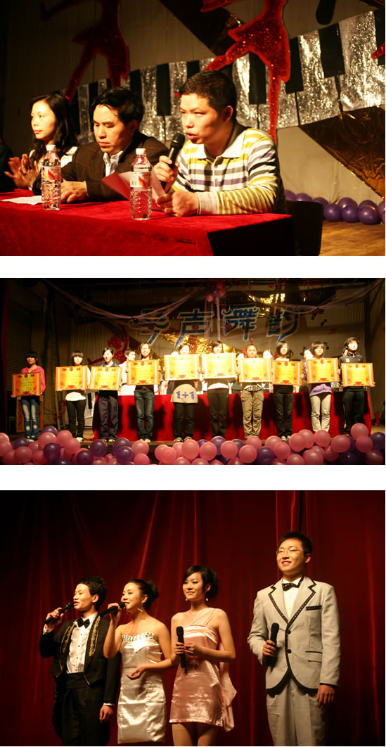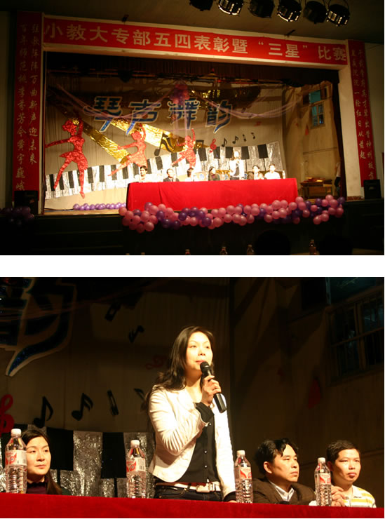 表彰大会由我部学工办主任、团总支书记孙侠主持。会上,蒋蓉主任发表了热情洋溢的致辞,寄语同学们一要高举爱国主义旗帜,坚定理想信念;二要加强组织建设,提高能力水平;三要努力提高素质,争当发展先锋。院团委任晓晴书记对我部的共青团工作给予了高度评价,并号召全体青年同学发扬“五四”精神,不断开拓创新,谱写美妙青春华章。蔡海军副书记和张平柯副主任分别宣读了2009~2010年度我部学生集体和个人受表彰名单。5个“院先进团支部”、17个“优良学风班级”、9个“教室设计比赛”获奖班级、21个“星级寝室设计比赛”和1名“湖南省优秀团员”、5名“湖南省优秀青年志愿者”、28名院级“优秀学生干部”、56名院级“优秀团员”、665名系级“优秀团员”、“优秀学生干部”及“三好学生”受到表彰。城南书院校区管委会张洪章副主任、学生处何文处长、院团委任晓晴书记等领导为受表彰集体和个人颁奖。“三星”比赛的主题是“琴声舞韵”,由易文颖、王乐瑶、龙昱冰、杨晴、张乐、许芸芸等老师担任本次比赛专业评委。比赛中“歌”、“舞”、“乐”穿插表演,21个精彩的节目或吟唱时代的激越,或舞动青春的美丽,或奏响岁月的精彩,充分展示了我部青年学子的风采,为现场观众奉献上一顿视觉与听觉上的的饕餮大餐,赢得了评委和观众一致好评。最终526班何琴同学、521班周文君同学分别夺得“歌”、“舞”表演的冠军;575班陈方圆同学、577班张进同学并列夺得乐器表演的冠军。