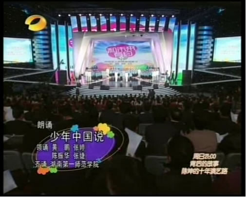 11月29日晚,由湖南省委宣传部和湖南卫视共同举办的全国未成年人思想道德建设主题晚会——“和未来有约”在世界之窗五洲大剧院盛大举行,12月2日晚7点45湖南卫视全程播出。中共中央政治局常委李长春、湖南省委书记张春贤及32个省市的宣传专干出席了本次晚会。晚会由何炅、汪涵担任主持。我部学生表演的百人朗诵《少年中国说》、参演的合唱《最好的未来》大展一师学子的风采,激情豪迈之情渲染全场。
