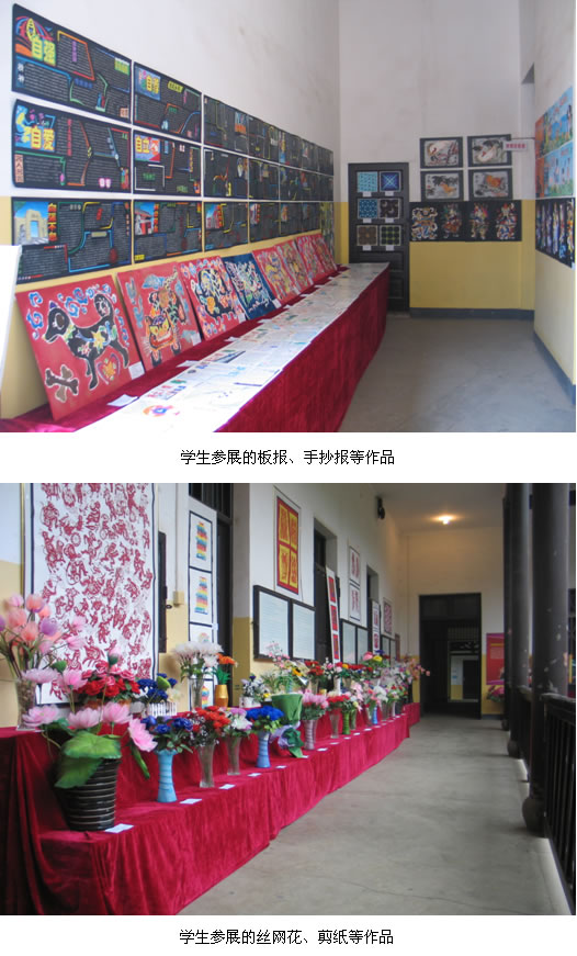 为了迎接2009年全国教师教育学会小学教师教育委员会年会在我院的召开,同时配合我院团委组织的校园文化艺术节活动,我部筹办的小教大专部学生美术作品展于11月14日上午在青年毛泽东纪念馆八班寝室所在的四合院隆重开展,300余幅作品摆满了四合院走廊。这些作品都是小教大专部学生用综合材料创作的,有芭比娃娃、刺绣、沥粉画、丝网花、剪纸、版画、板报、手抄报、民族服装设计等多种形式,充分展示了小教大专部学生高水平的综合素养。